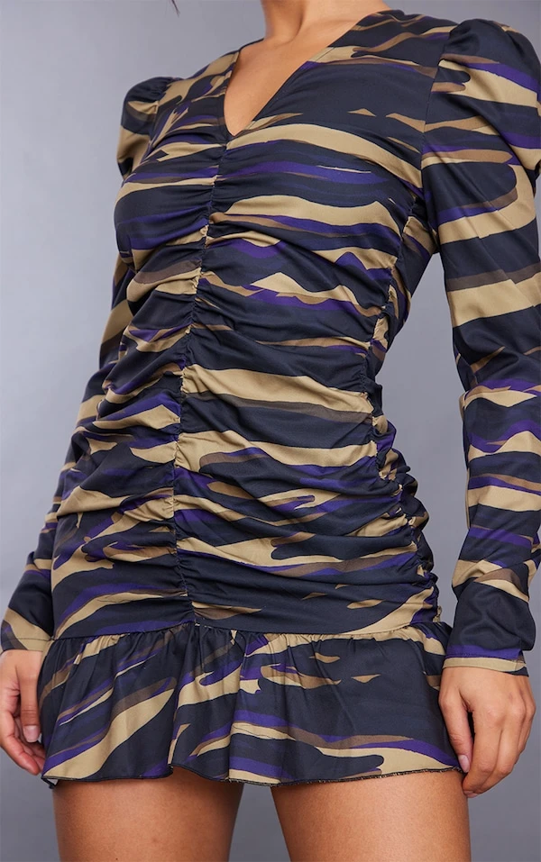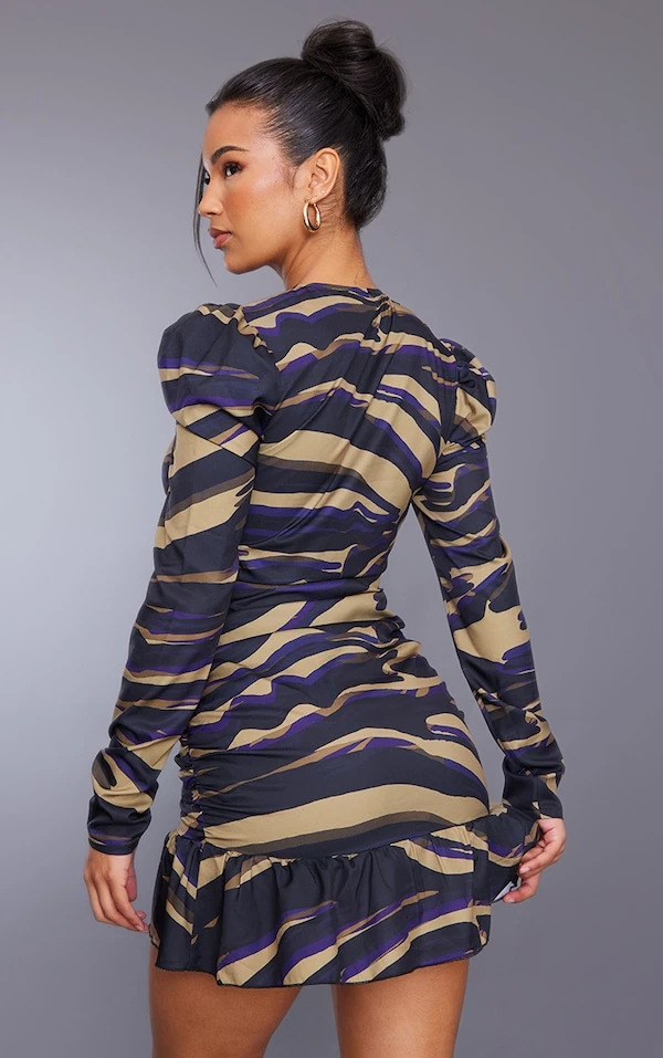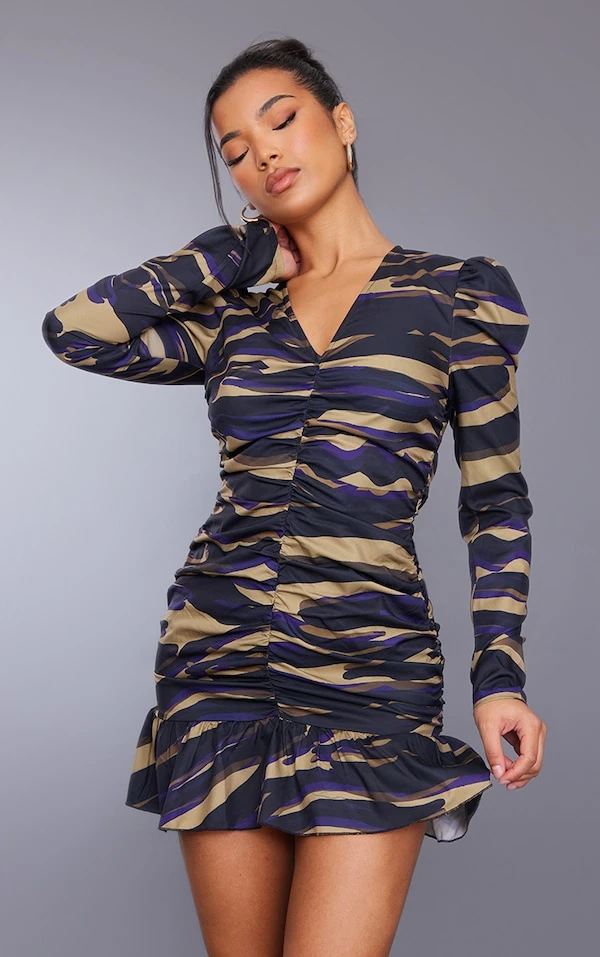 Robe moulante imprimée zèbre multicolore froncée à col V volanté