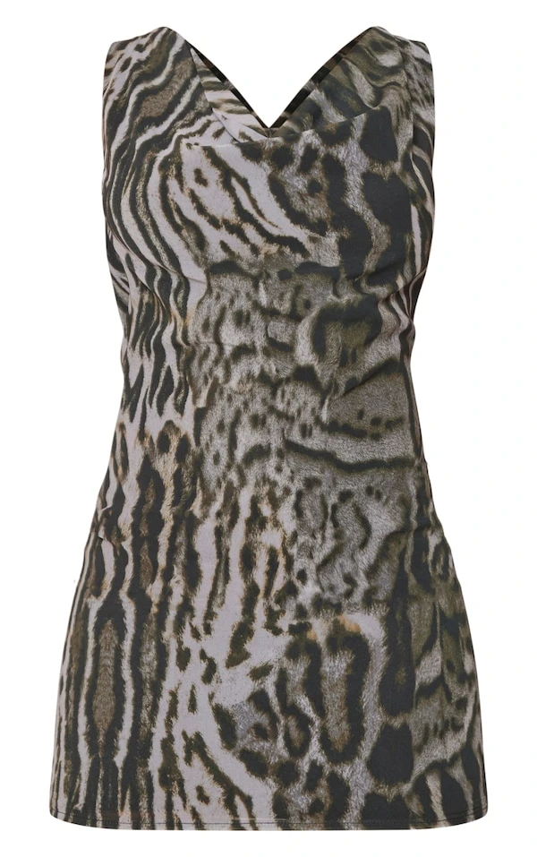 Robe moulante marron à imprimé léopard à col bénitier et dos nu