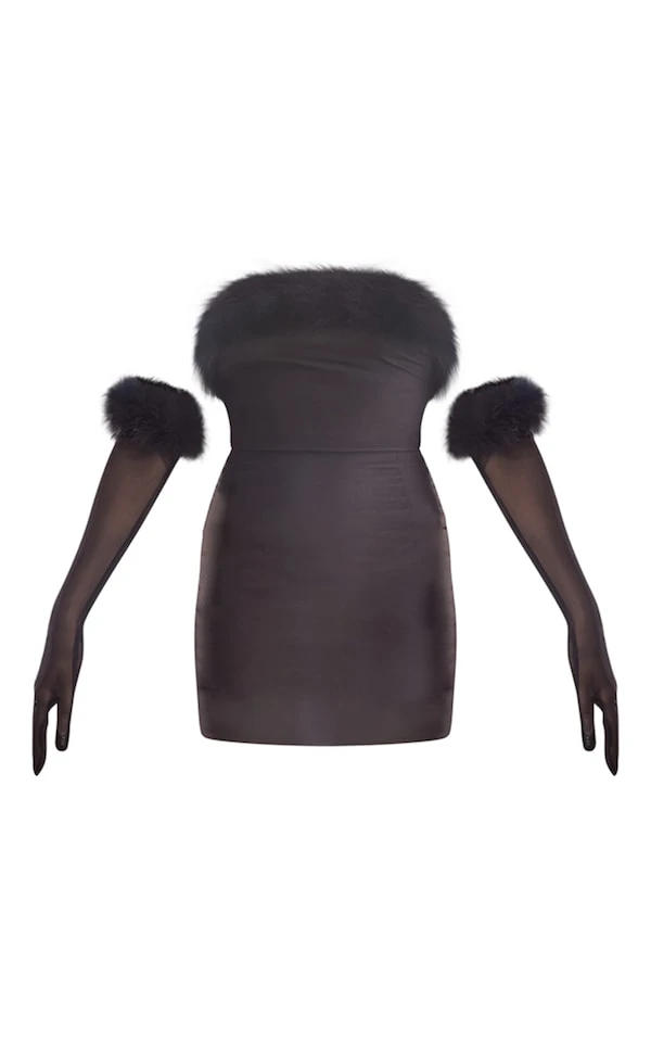 Robe moulante noire à épaules dénudées manches gants et ourlet à plumes