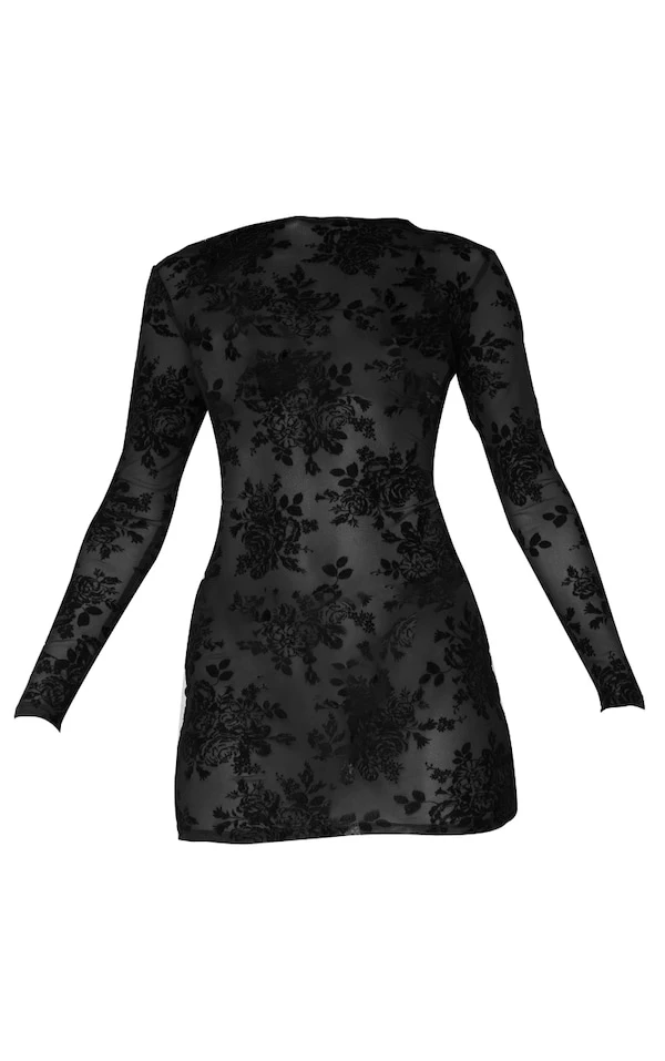 Robe moulante noire fleurie floquée à manches longues et dos lacé