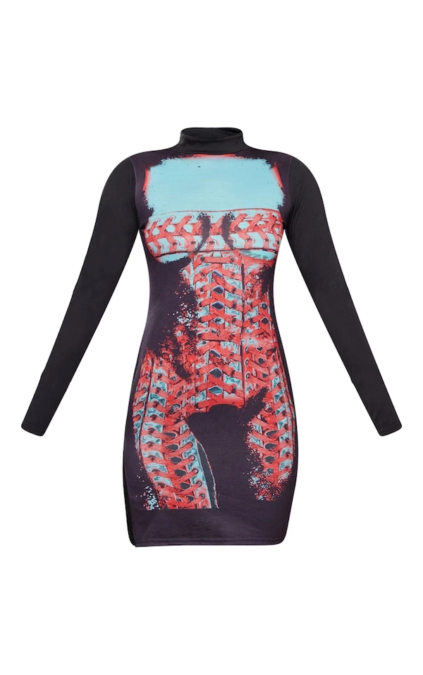 Robe Moulante Noire Imprimé Corps à Col Montant Et Manches Longues
