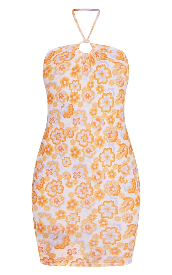 Robe moulante orange fleurie rétro à dos nu et détail anneau