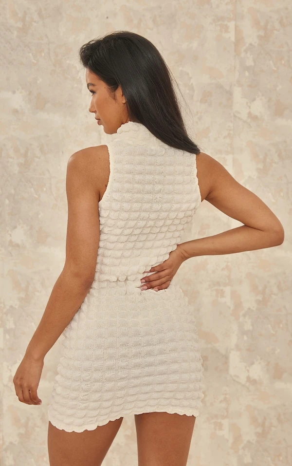 Robe moulante sans manches blanche texturée effet bulle à col montant