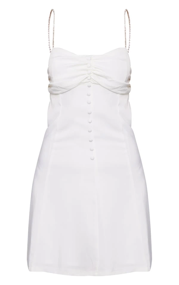 Robe moulante satinée blanche à boutons et bretelles strassées