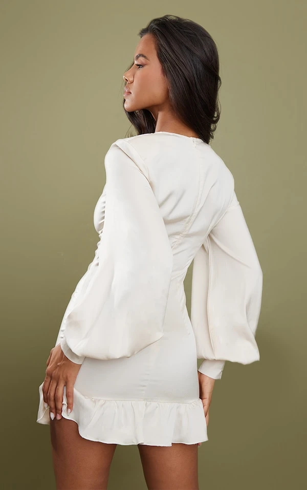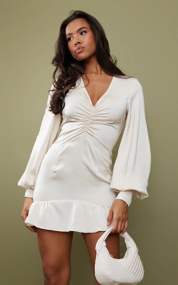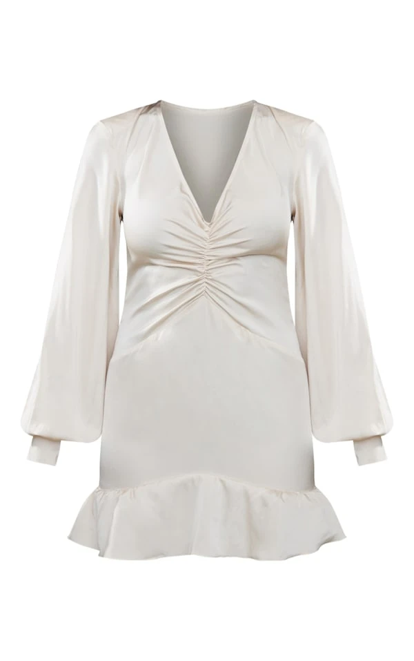 Robe moulante satinée froncée champagne à décolleté et ourlet volanté