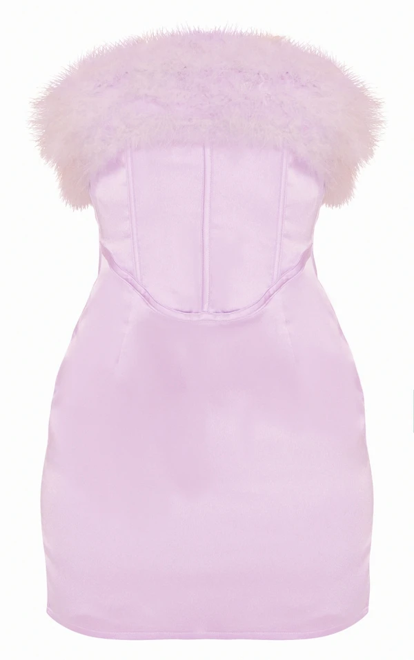 Robe moulante satinée lilas à corset et bordure en plumes