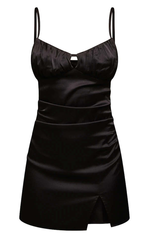Robe moulante satinée noire à bonnets froncés et bretelles