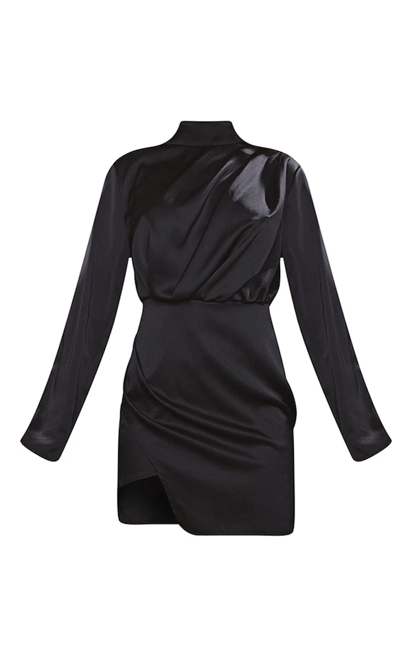 Robe moulante satinée noire à épaulettes et manches longues