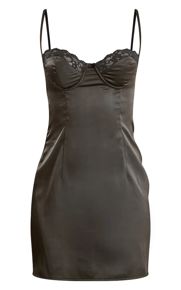 Robe moulante satinée noire nouée derrière à bonnets en dentelle