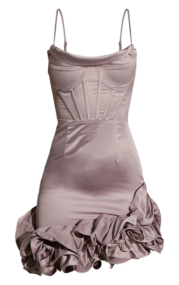Absolument in love de cette robe moulante ! Avec sa matière satinée, son style corset et ses volants, le tout dnas un mauve très doux, c’est impossible de résister. Il ne manque que des talons !
