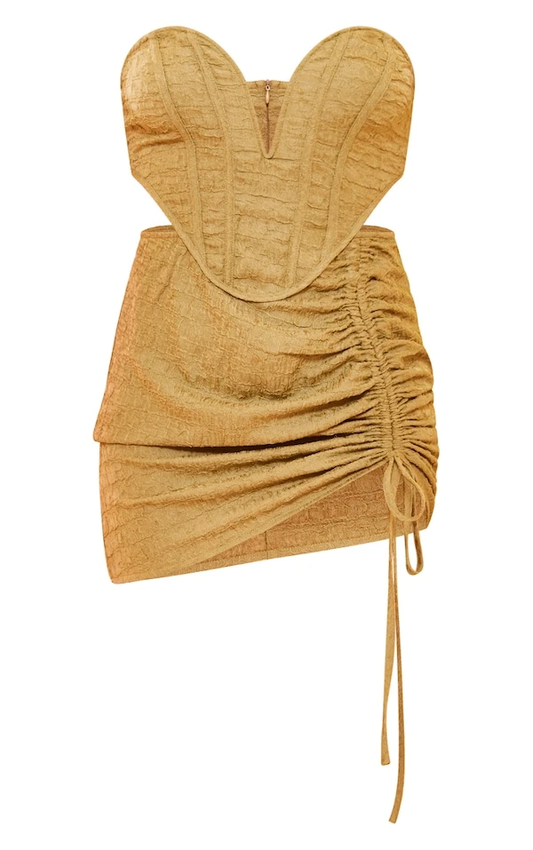 Robe moulante texturée vert olive à barre en V plongeante et jupe froncée