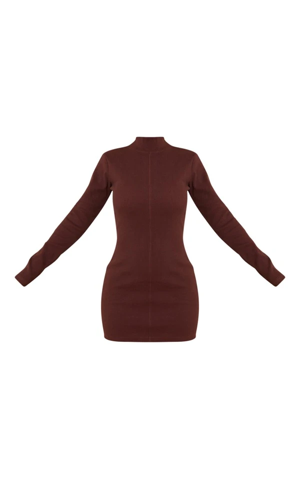 Robe moulante très côtelée chocolat à col montant et ouverte au dos