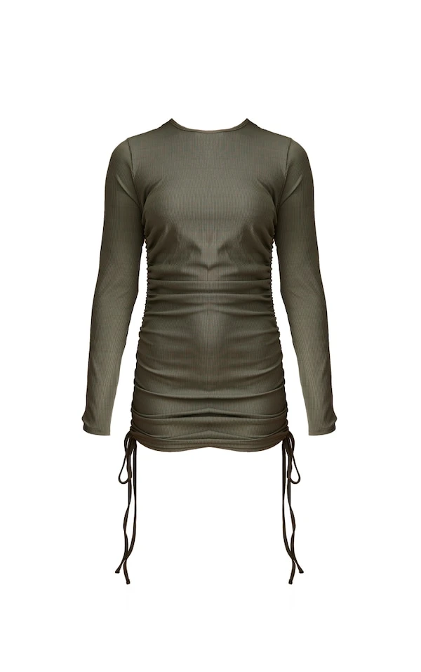 Robe moulante très côtelée kaki à côté froncé