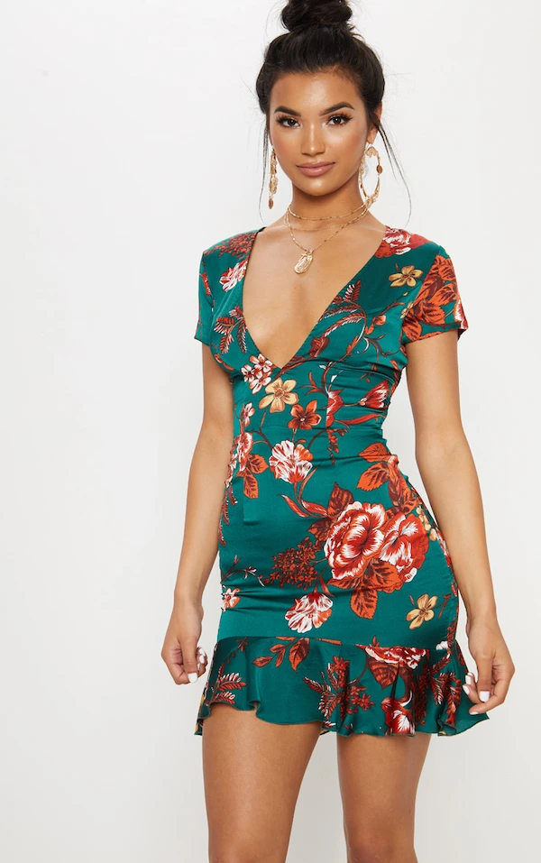 Robe moulante vert émeraude florale volantée avec croisillons au dos