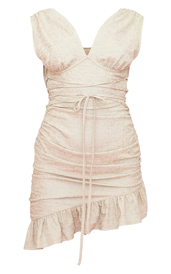 Robe moulante vert sauge crêpée nouée sur la taille à décolleté et ourlet volanté