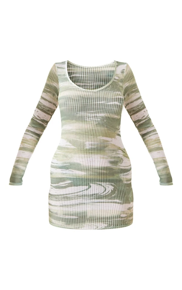 Robe moulante verte imprimée griffure côtelée à manches longues