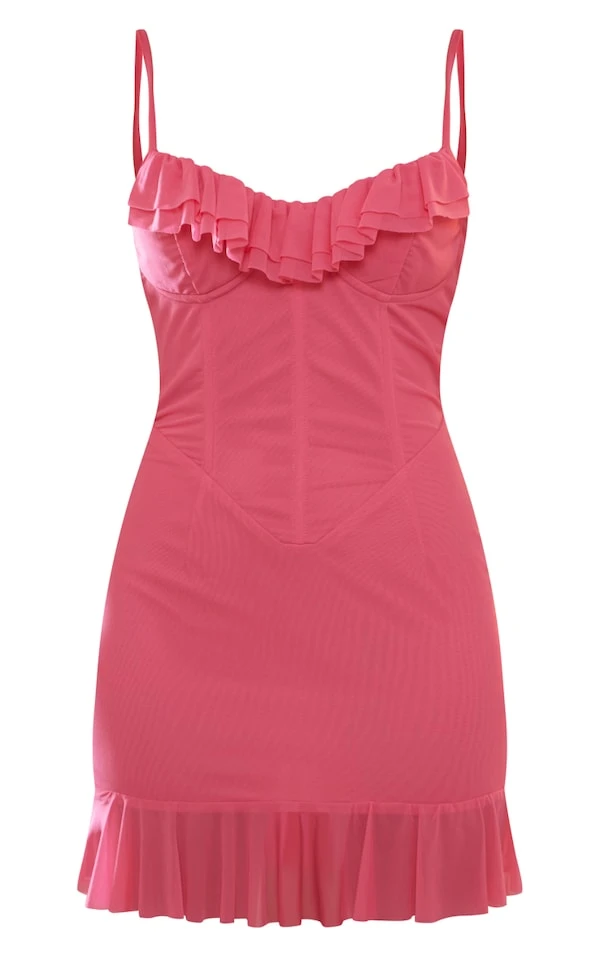 Robe moulante volantée rose vif à corset en mesh et bretelles