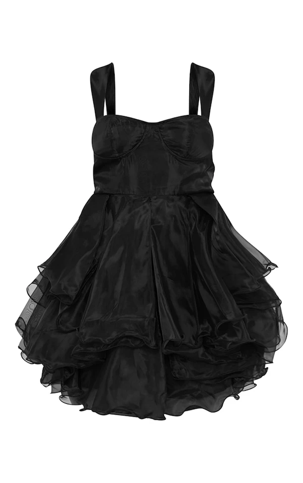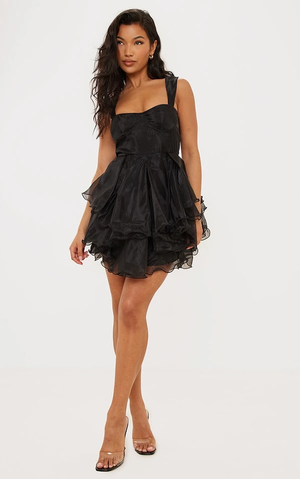 Robe patineuse noire en organza à bretelles épaisses et superpositions