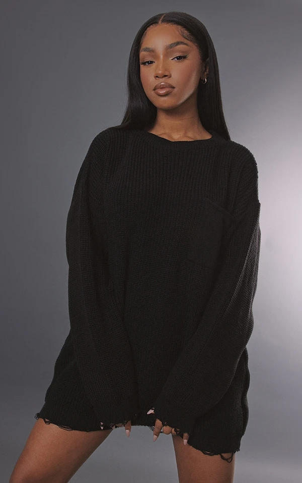 Canon dans cette robe pull. Avec sa matière en maille épaisse, sa couleur noire qui se porte avec tout sans jamais décevoir et son design à ourlet élimé, elle a tout pour plaire. Portez-la avec une paire de bottes et quelques accessoires pour faire une entrée remarquée à la prochaine soirée !