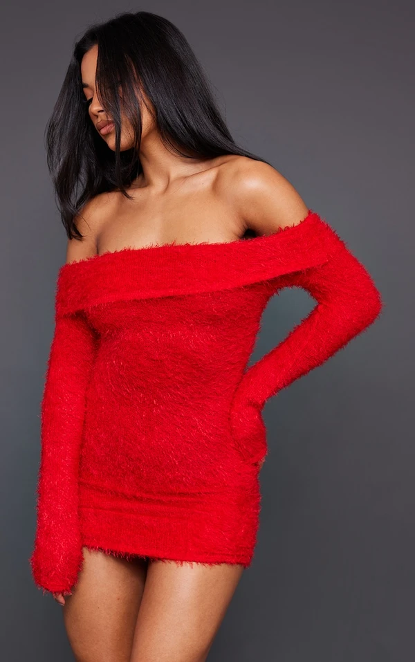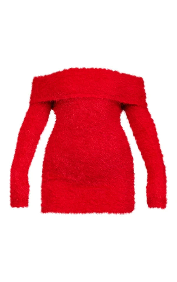 Robe pull moulante en maille duveteuse rouge à col bardot