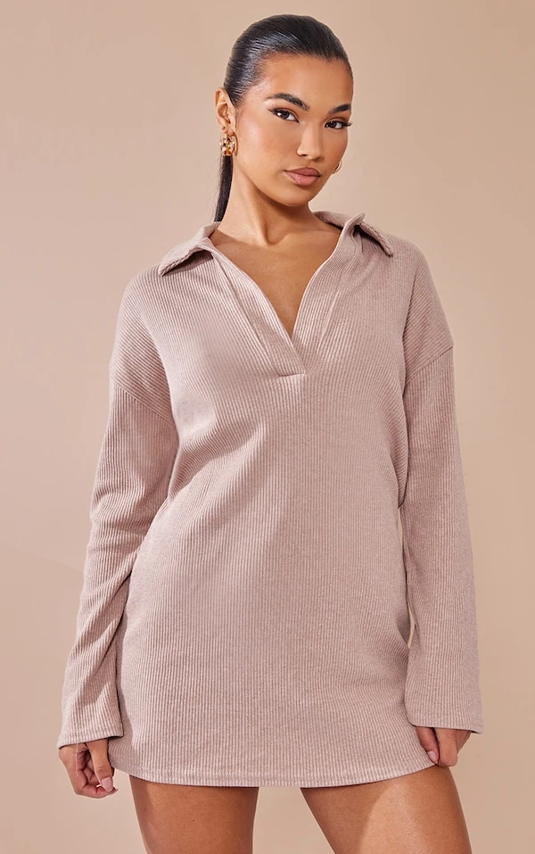 Robe pull oversize côtelée gris pierre à col en V
