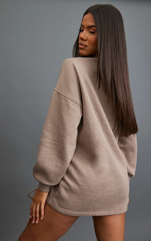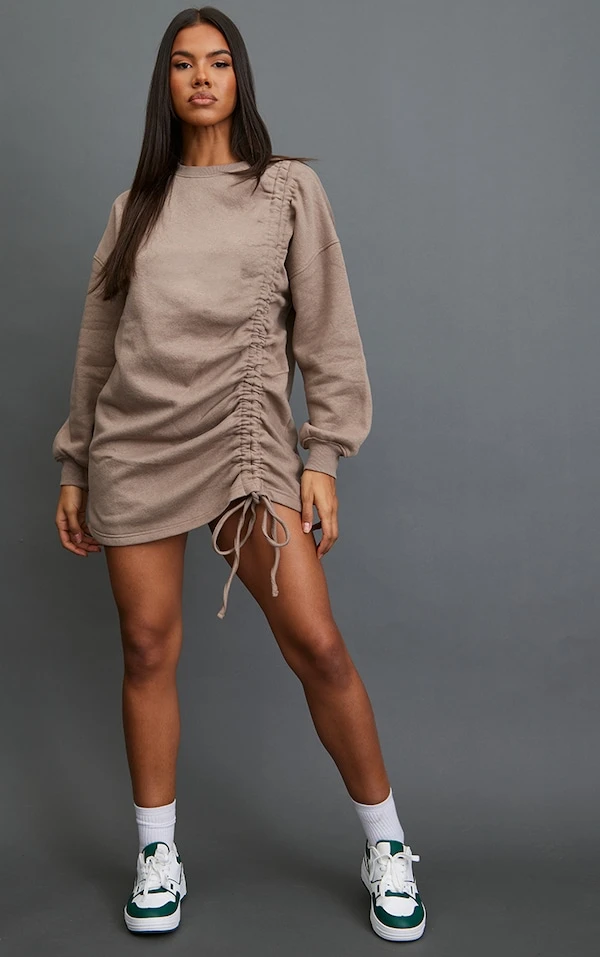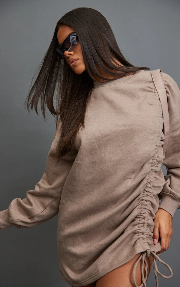 Robe pull oversize taupe en sweat froncé oversize à col ras