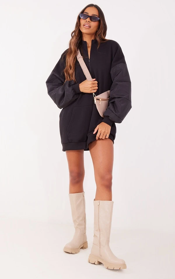 Trop stylée dans cette robe en sweat ! On aime tellement son coloris noir tout classique, son style oversize et ses manches en nylon contrastantes. C’est à porter avec une simple paire de baskets pour chiller en jour off. On adore !