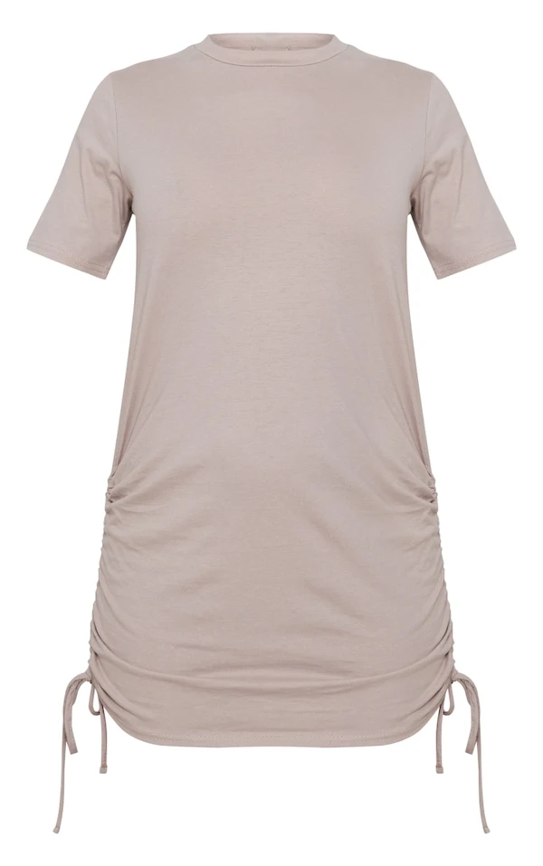 Robe t-shirt en coton gris pierre à manches courtes et côtés froncés