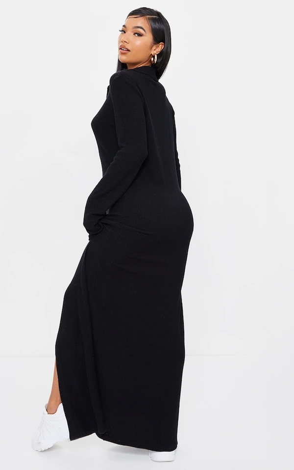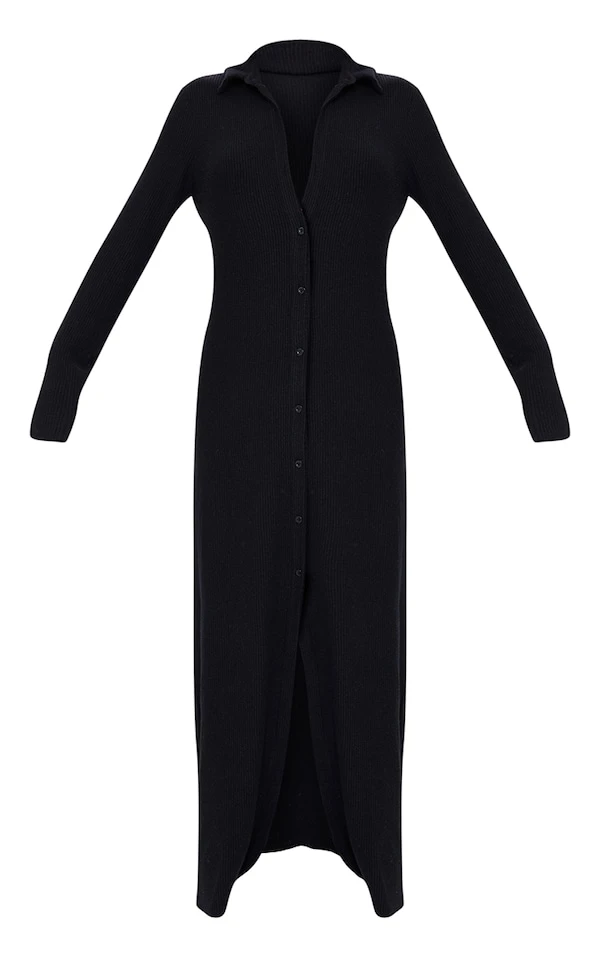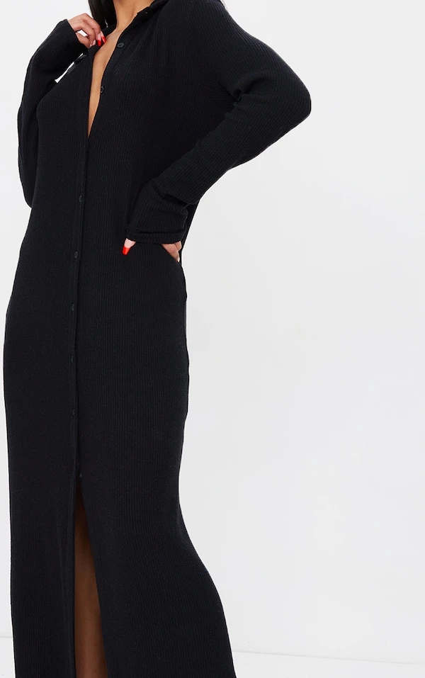 Crush infini sur cette robe côtelée ! On adore la coupe très longue, les boutons sur l’avant, la matière toute douce et le détail du col, le tout dans un noir classique. Il ne manque que des baskets pour le look final !