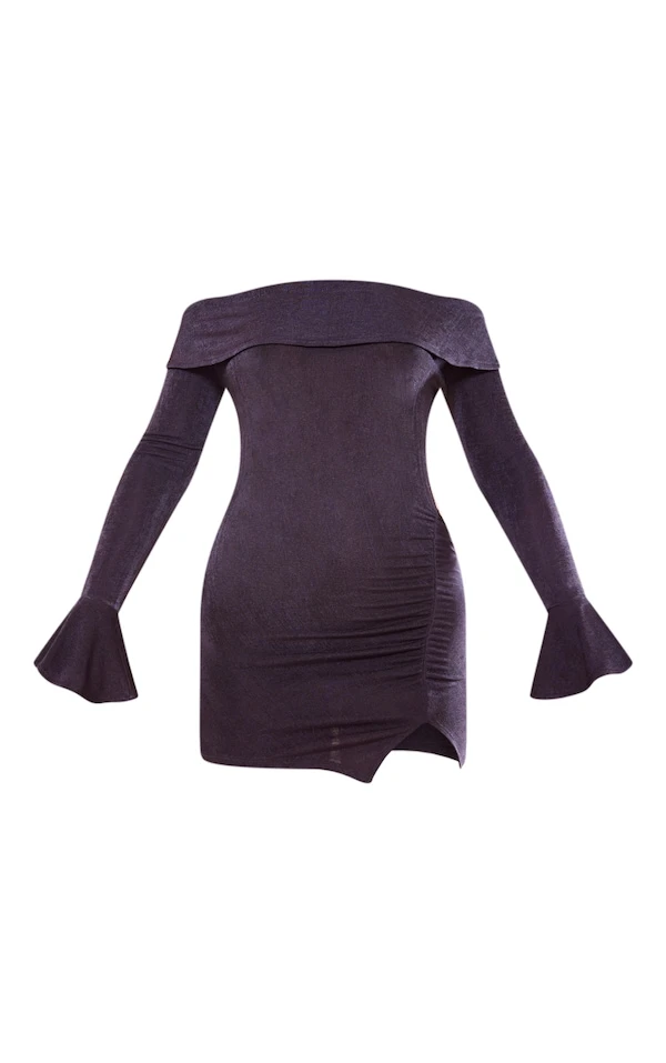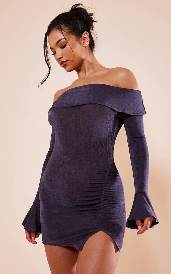 Robe très moulante en acétate kaki à manches évasées et col bardot