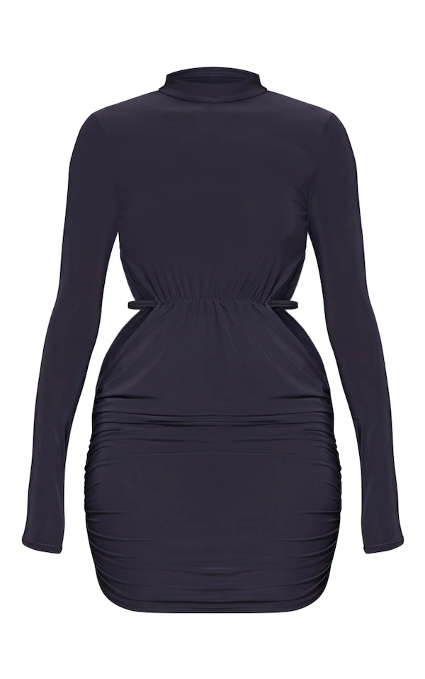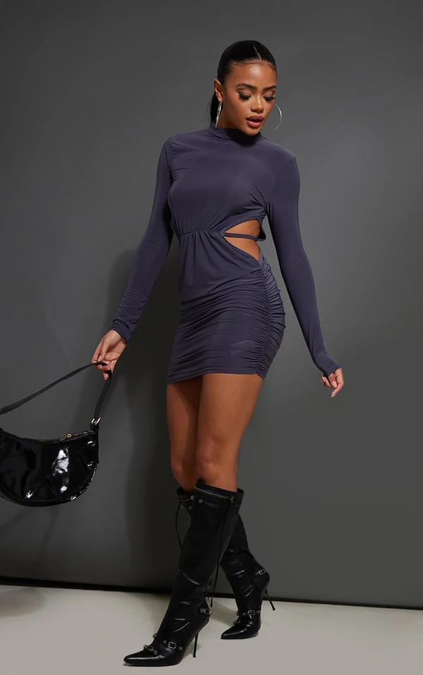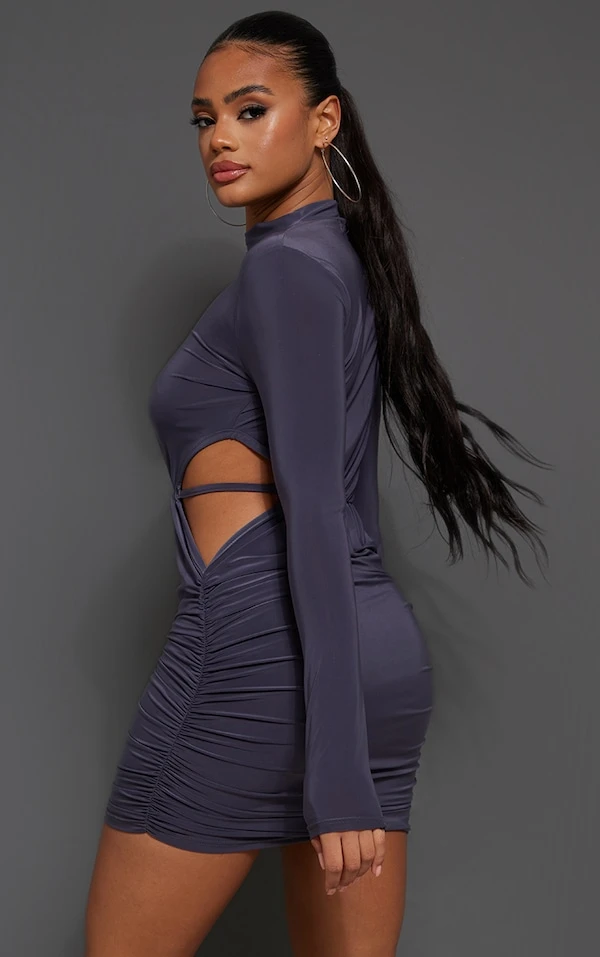 Robe très moulante froncée gris anthracite à dos découpé et manches longues