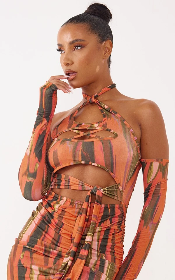 Robe très moulante orange imprimé abstrait découpée à liens et épaules dénudées