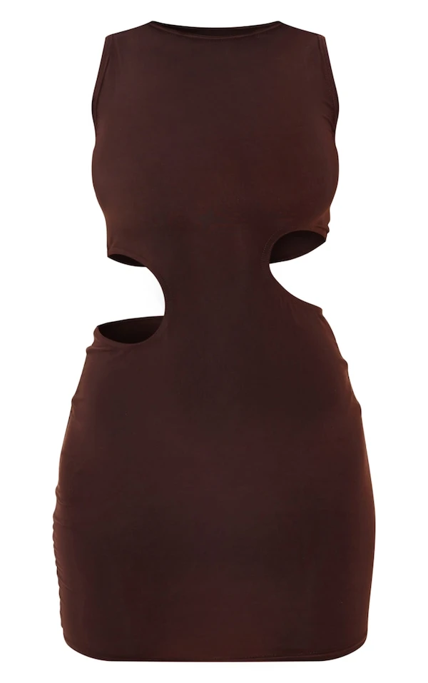 Robe très moulante sans manches chocolat découpée sur les côtés