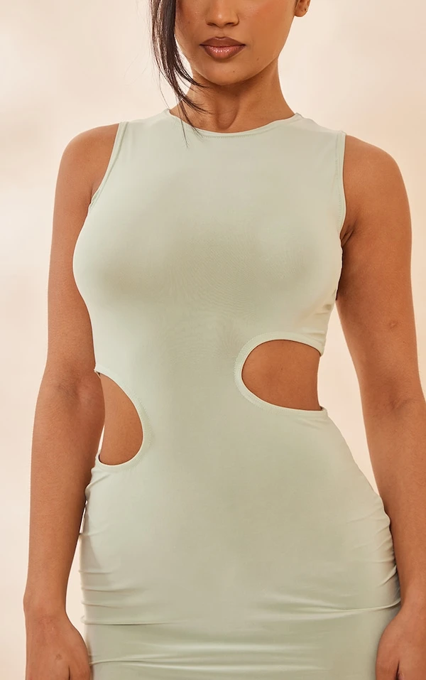 Robe très moulante sans manches vert sauge découpée sur les côtés