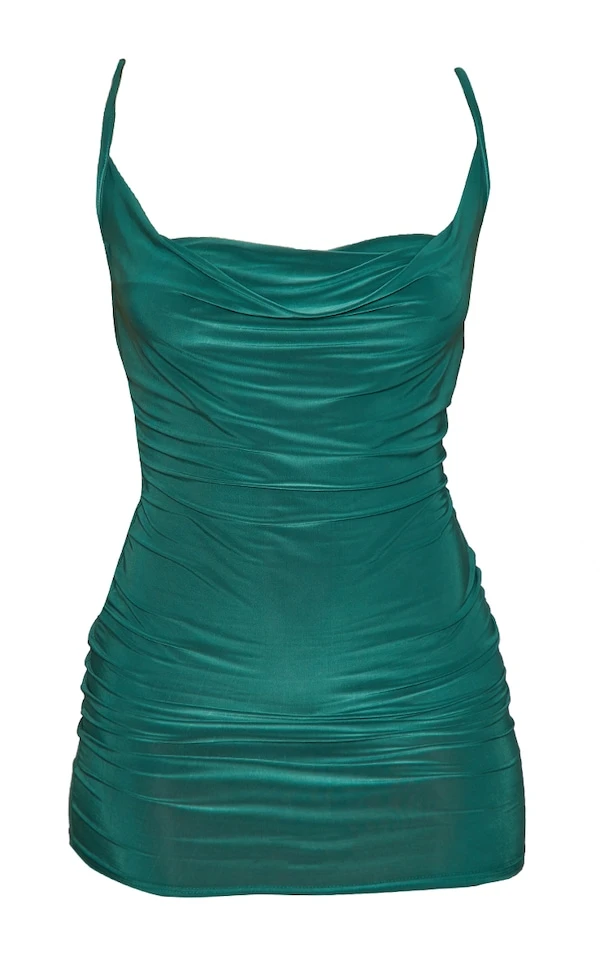 Le crush est infini pour cette robe vert émeraude ! Avec son col bénitier, ses fines bretelles et sa coupe très moulante, elle fait années 2000 et on adore. il ne manque que des talons et un petit sac pour le look complet !