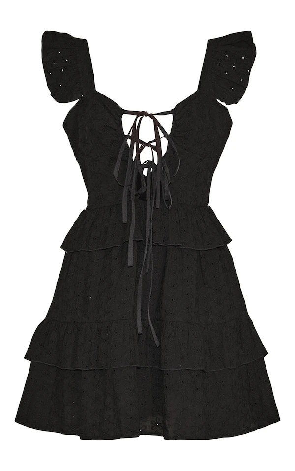 Robe volantée droite noire à broderie anglaise et lanières