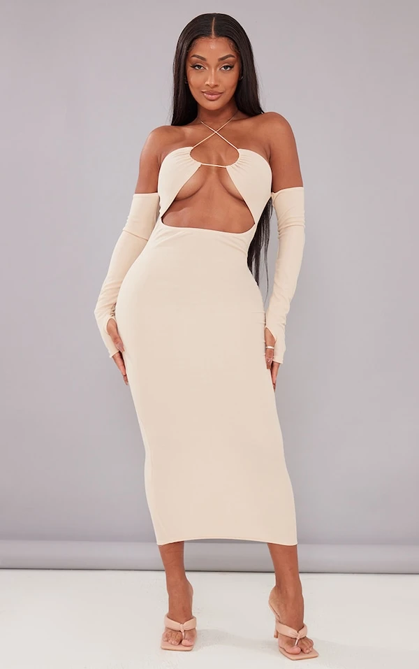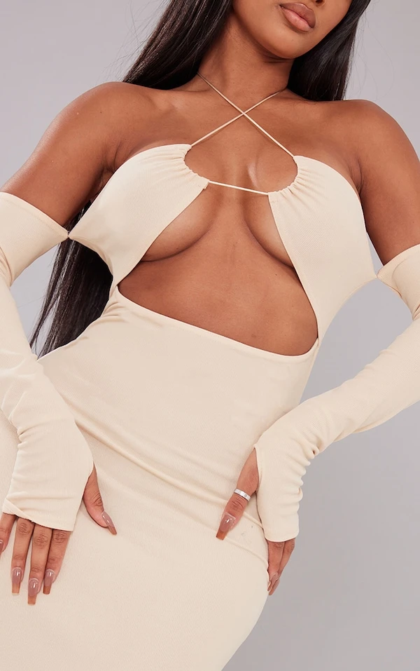 Shape Robe longue côtelée douce gris pierre à col bardot nouée sur le devant