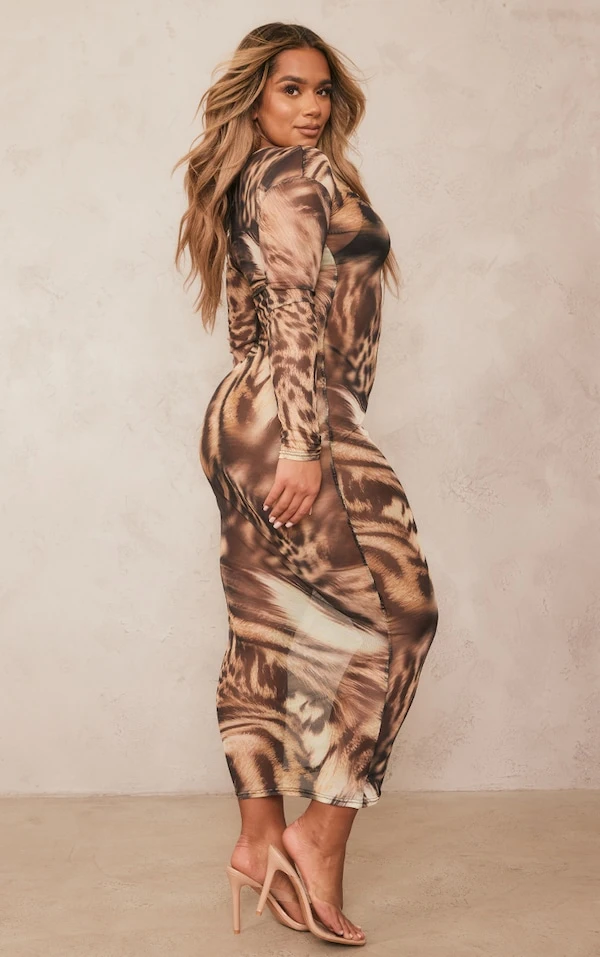 Shape Robe longue en mesh marron à imprimé léopard et manches longues