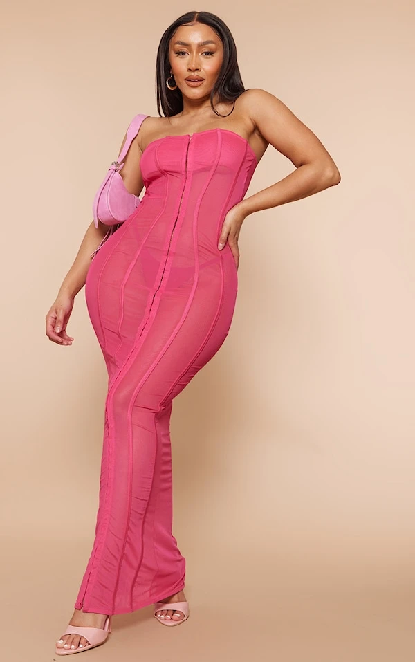 In love de cette robe longue ! Avec sa matière en mesh, sa couleur rose vif qui attire tous les regards et le détail de ses coutures, on ne peut que valider. Il suffit de la porter avec une paire de talons et un petit sac à main rose et le tour est joué. Encore un look qui ne passe pas inaperçu !