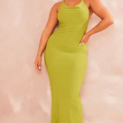 Shape Robe longue moulante dos nu arrondi vert olive froncée à bretelles et col bénitier
