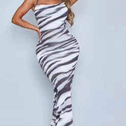 Shape Robe longue noire moulante imprimé zébré à col bénitier