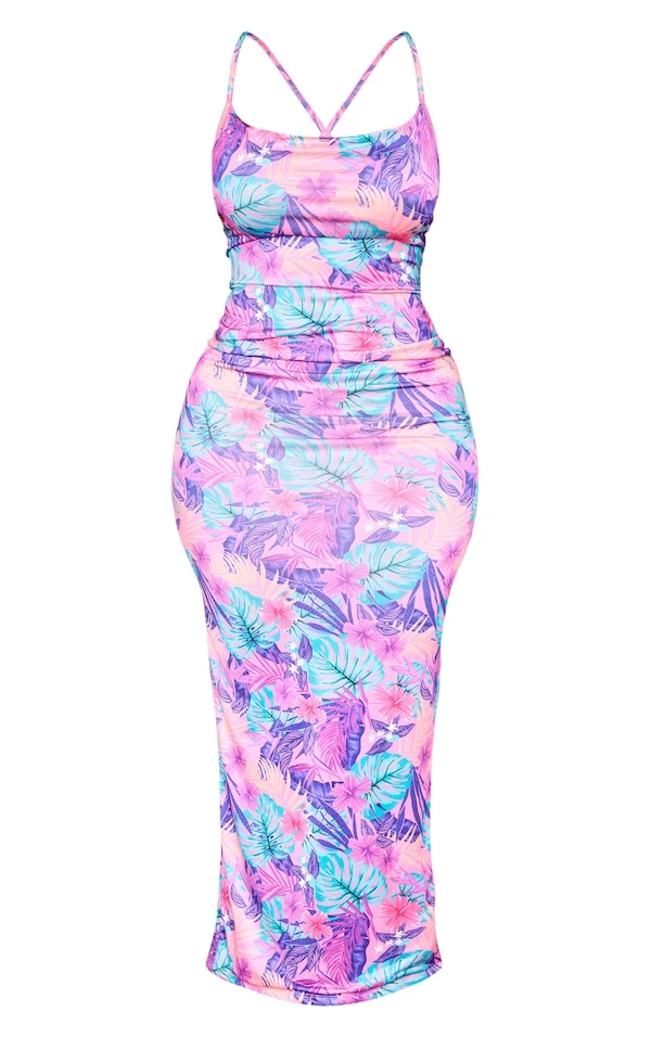 Shape Robe longue rose moulante imprimé tropical à col bénitier