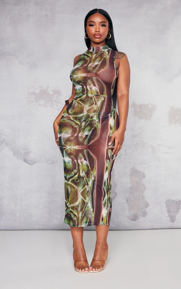 Shape Robe longue sans manches en mesh transparent découpé kaki imprimé reptile