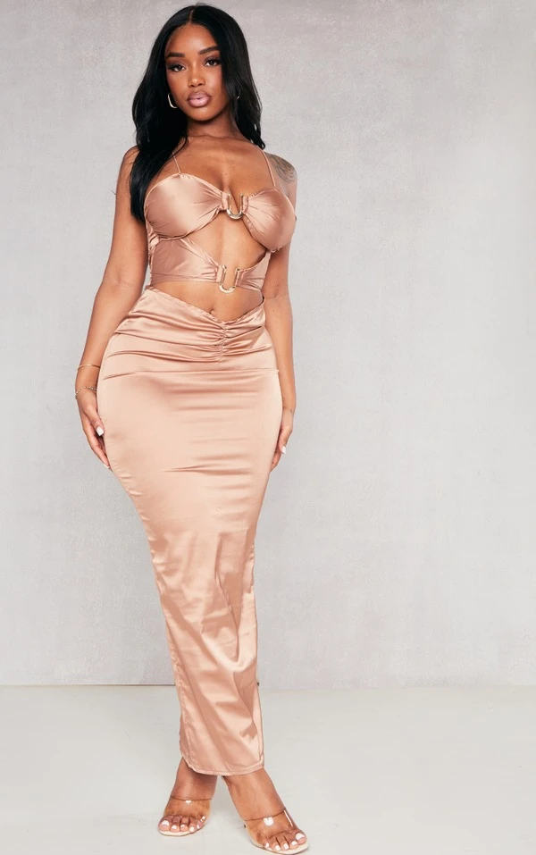 Shape Robe longue satinée bronze à découpes détail empiècement