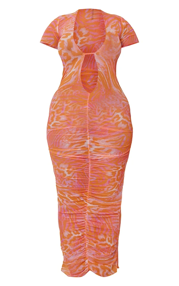 Shape Robe longue transparente froncée orange imprimé abstrait à décolleté