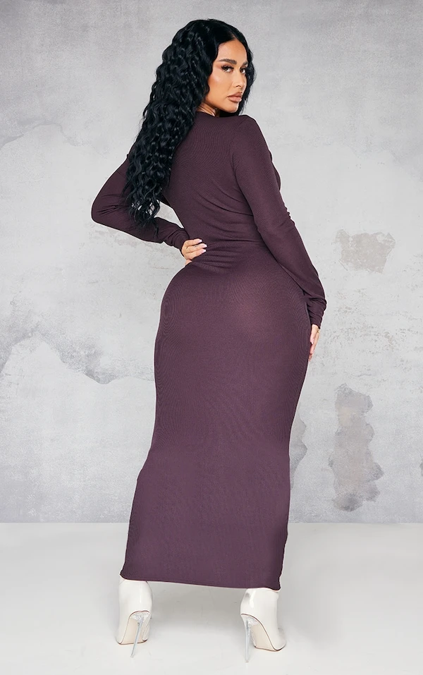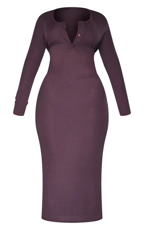 Shape Robe mi-longue chocolat côtelée à manches longues et boutons à l’avant