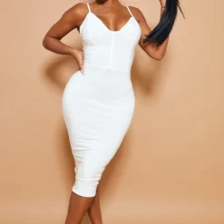 Les robes mi-longues sont in en ce moment et LA solution en cas de panne d’inspi pour une soirée entre copines. On adore le coloris blanc, le décolleté plongeant et le détail contraste. On la porte avec des talons transparents et des accessoires, un sans faute fashion!
