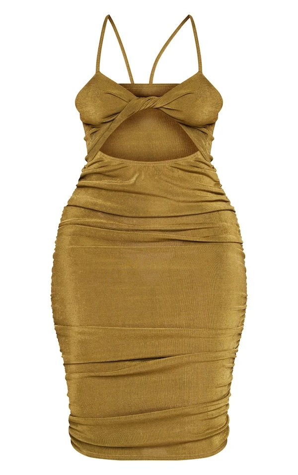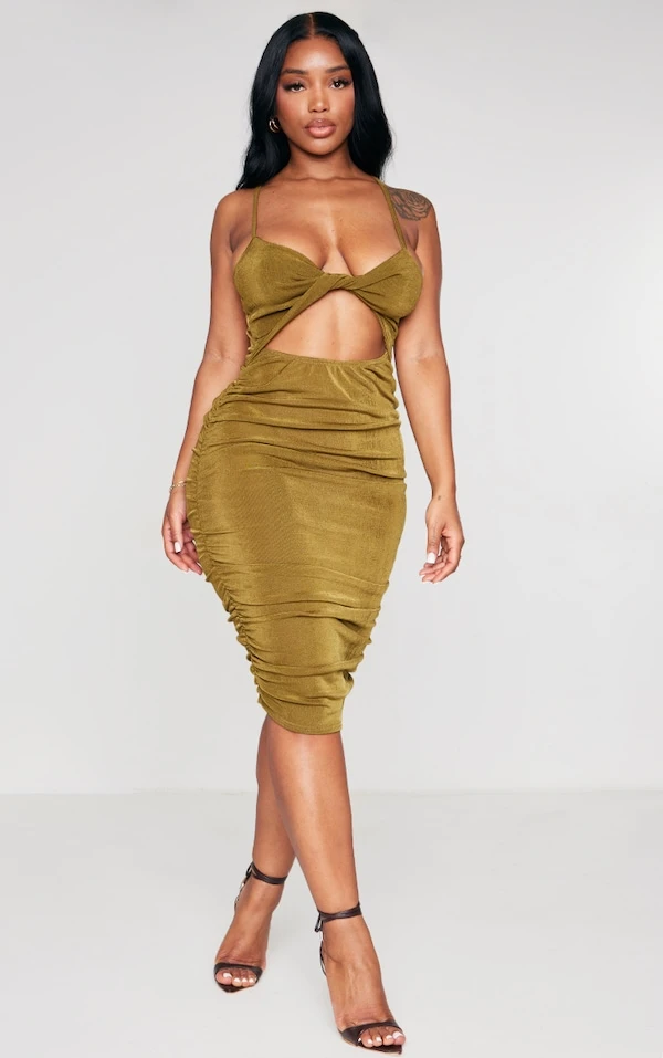 Wow, on est fans de cette robe moulante ! Avec sa couleur vert olive originale et son design torsadé canon, elle nous fait craquer en quelques secondes. Pour un date avec bae, on ajoute des accessoires et des talons hauts. Vous êtes sensationnelle !