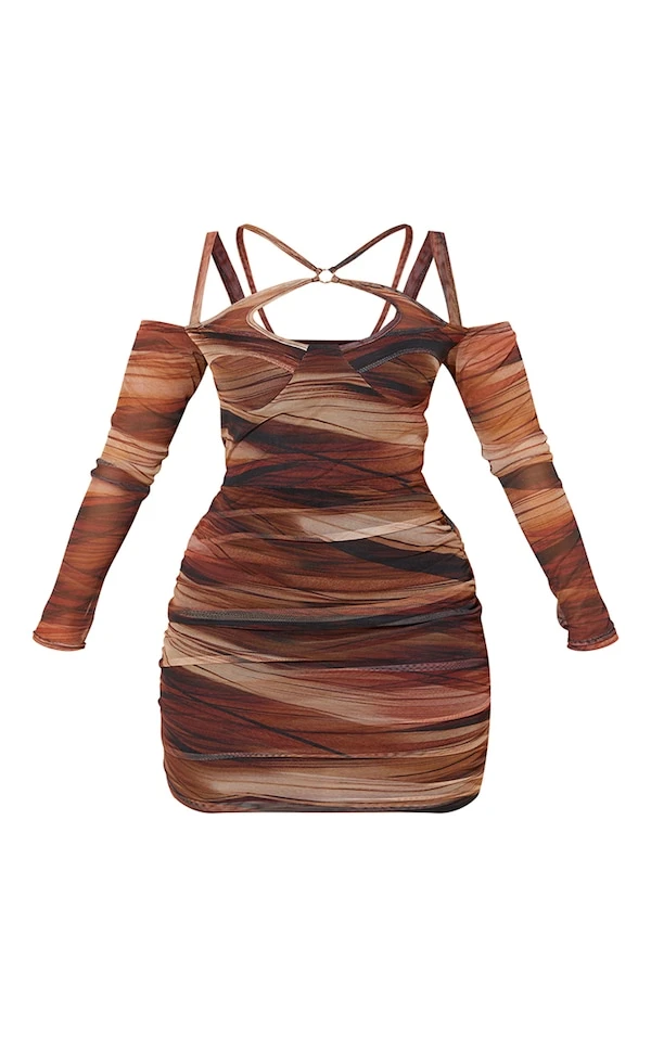 Shape Robe moulante en mesh froncé marron imprimé superposé à dos nu et anneau