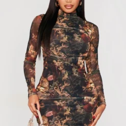 De toute beauté cette robe à la coupe moulante. Sa matière en mesh est canon et on adore son imprimé Renaissance très arty. Avec son coloris marron très flatteur, son col montant et son style parfait pour une soirée, c’est un craquage immédiat. On enfile une paire de talons, des créoles et voilà.